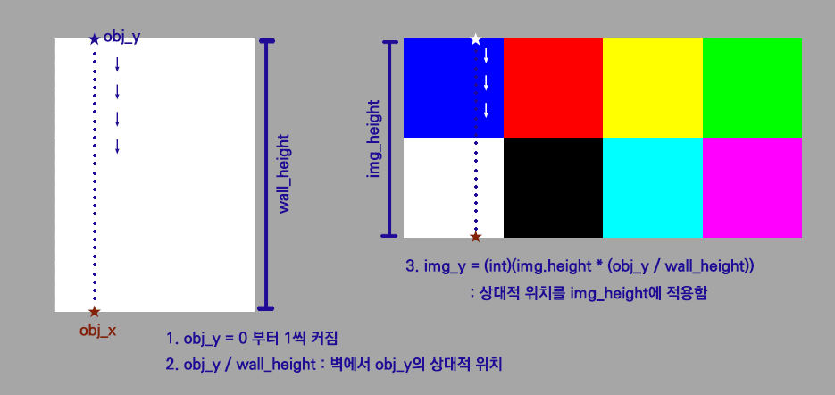 2. 벽 세로에 대한 obj_y의 상대적 위치를 구한다. 내 위치를 벽 높이로 나눠주면 상대적 위치를 구할 수 있다.