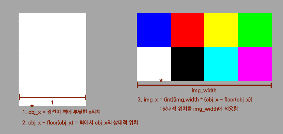 2. 벽 가로에 대한 obj_x의 상대적 위치를 구한다. 가로가 1이기 때문에 정수부분을 빼서 소수부분으로 상대적 위치를 구할 수 있다.